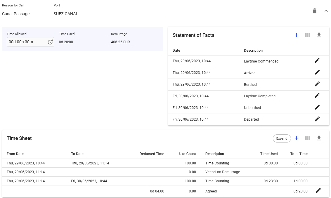 Starting with release 8.10, the system lets you create a laytime calculation for a canal passage; once created, you can add the time allowed and any deductions to register canal demurrage. The time allowed, as well as any time deductions, will not affect laytime calculations at other ports.&#x20;