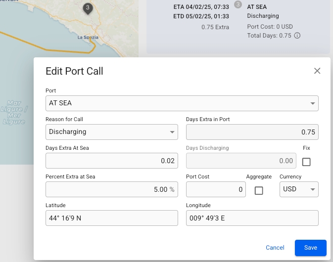 Furthermore, 'At Sea' port call coordinates can be updated in the 'Edit Port Call' modal, with all calculation automatically adjusted to reflect the new location.