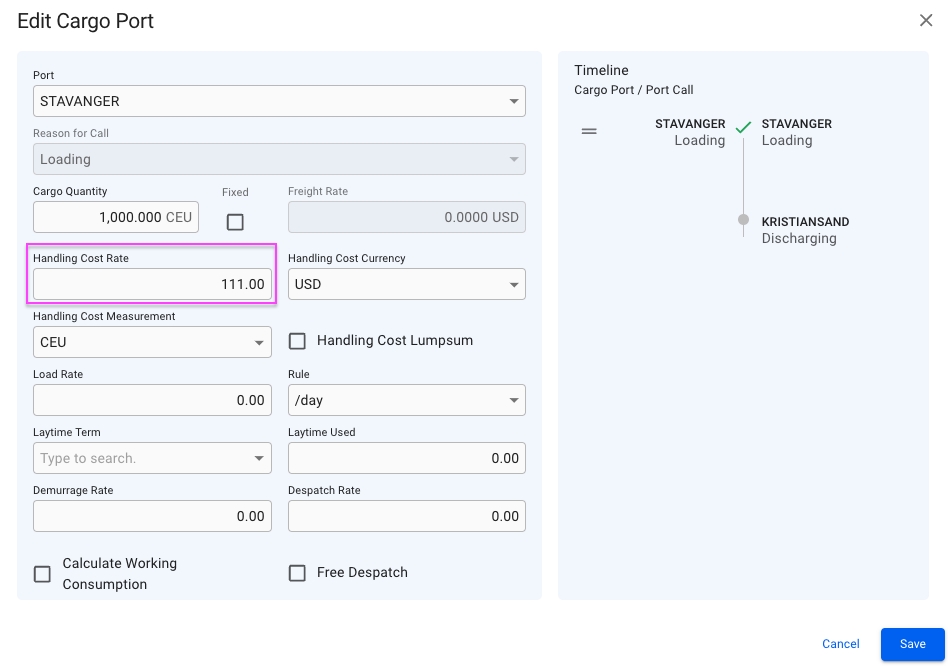 By default, the 'Use Handling Cost from Service Orders' checkbox is set to false. It will at the false state retrieve the value set in the 'Handling Cost Rate' field of the Stavanger Cargo Port, which you can set manually inside of the Edit Cargo Port modal: