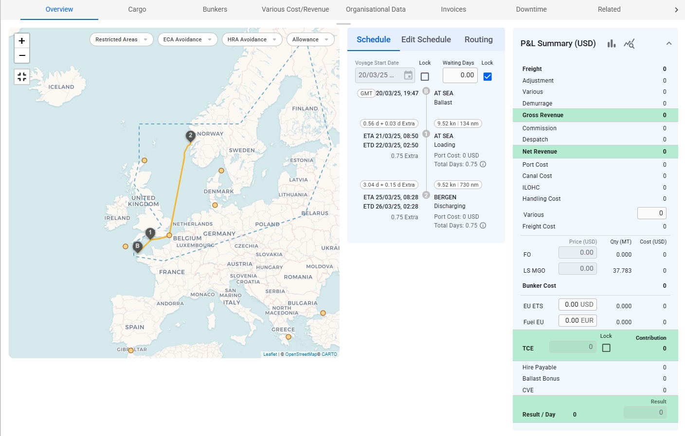 After creating a voyage, the ballast latitude and longitude can be modified by opening the voyage drawer and navigating to the vessel section (see Figure 3). These fields will only be available when the ballast port is set to 'At Sea'.