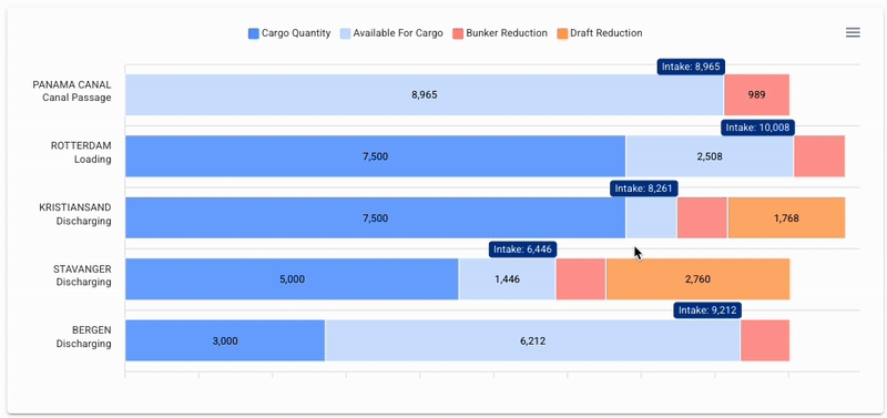 Below the grid, you will find a graph for the intake calculation, with a bar for each of the port calls in the voyage schedule. Each port call will have a small Intake-label, displaying the maximum intake. The x-axis is scaled to the maximum deadweight of the vessel, given the port zones in the schedule.