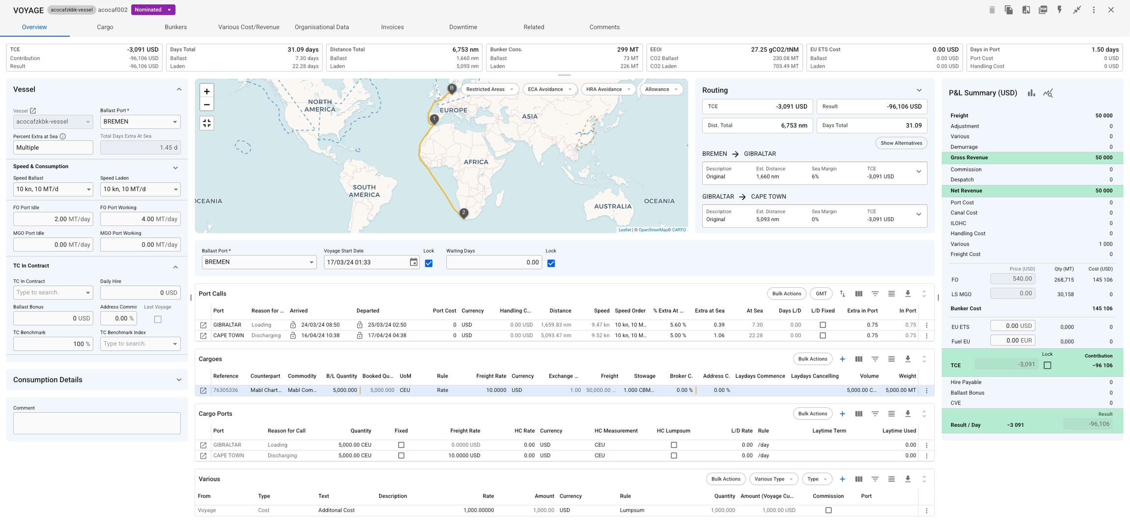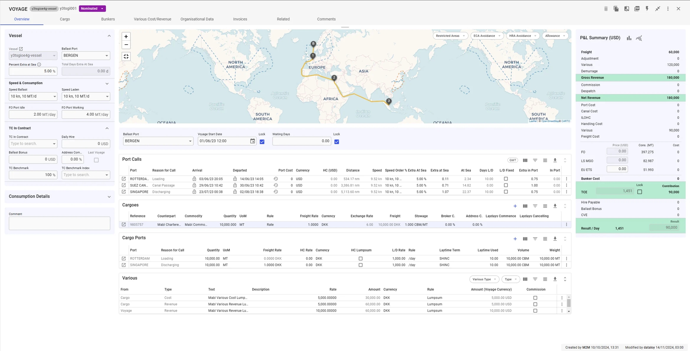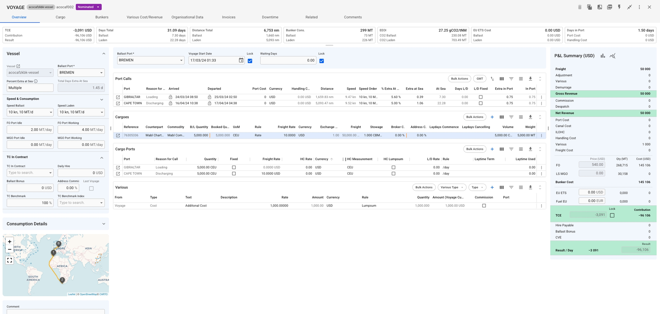 The Profit / Loss Section as well as the Vessel Section remains the same with the exception of an additional collapsible section for TC Out Contract.
