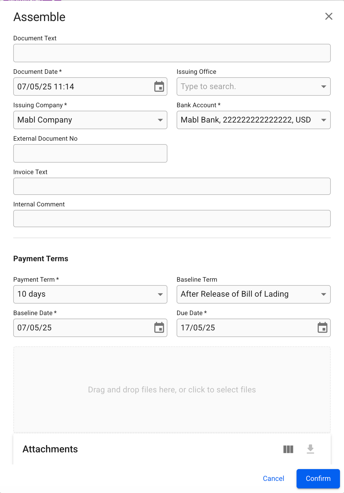 An assemble modal will open and some of the fields will be pre-filled. Make sure all mandatory fields (marked with *) are entered and click Confirm. The assembled invoice will open in a drawer.