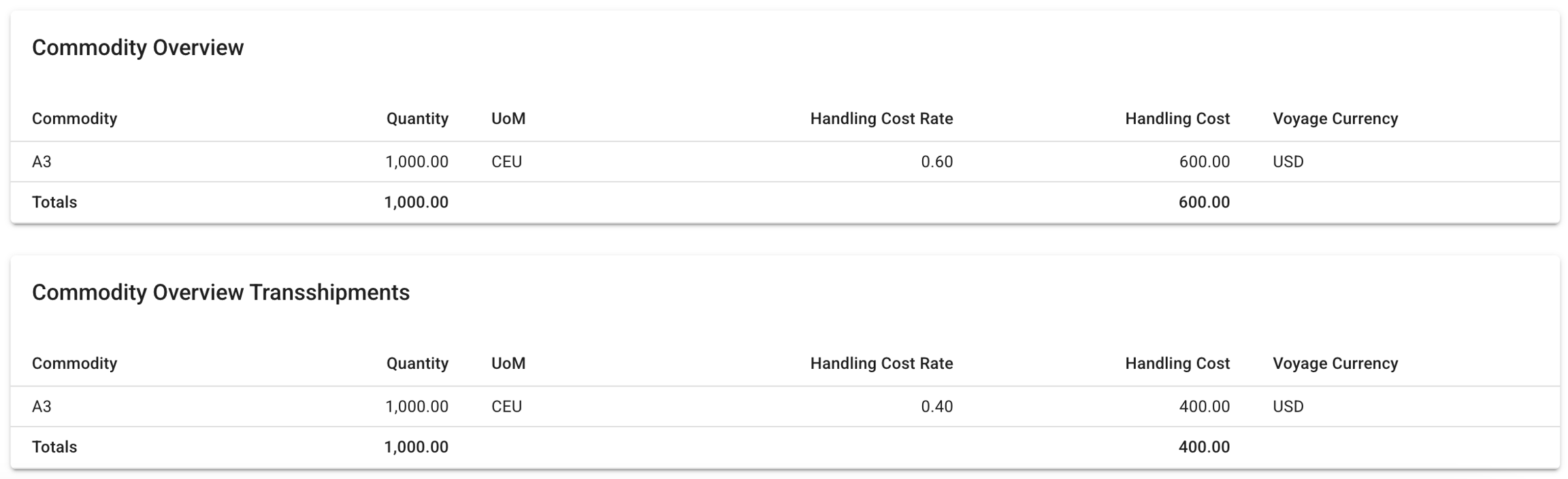 View non-transshipments and transshipments Commodity Overview tables, displaying e.g. the aggregated amounts of Handling Cost and Quantity (click to open in full):