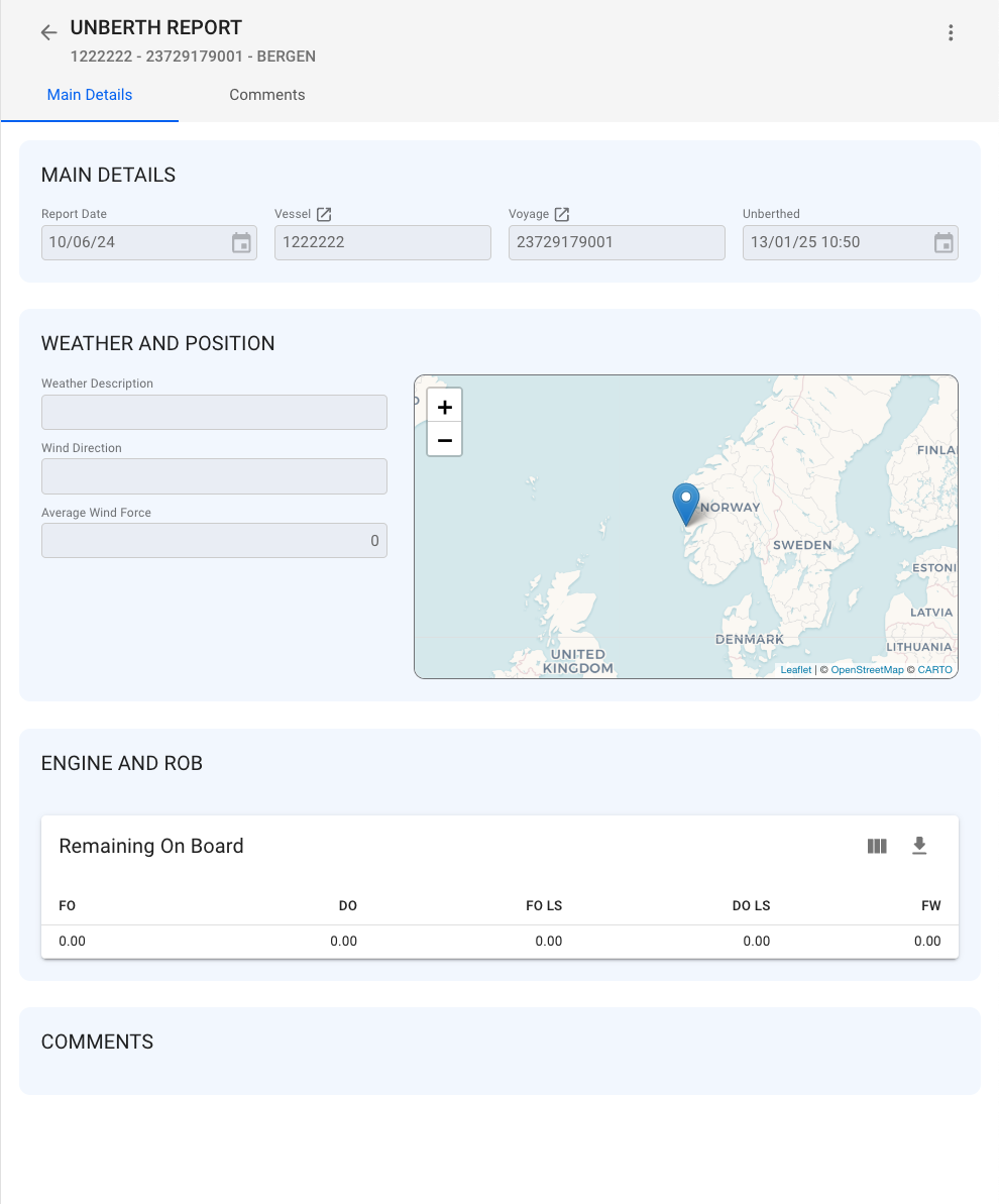 To view Vessel Reports, open the drawer for the given Port Call by clicking it in the list. Then click the tab "Vessel Reports" at the top of the drawer and a list with registered reports will be displayed.