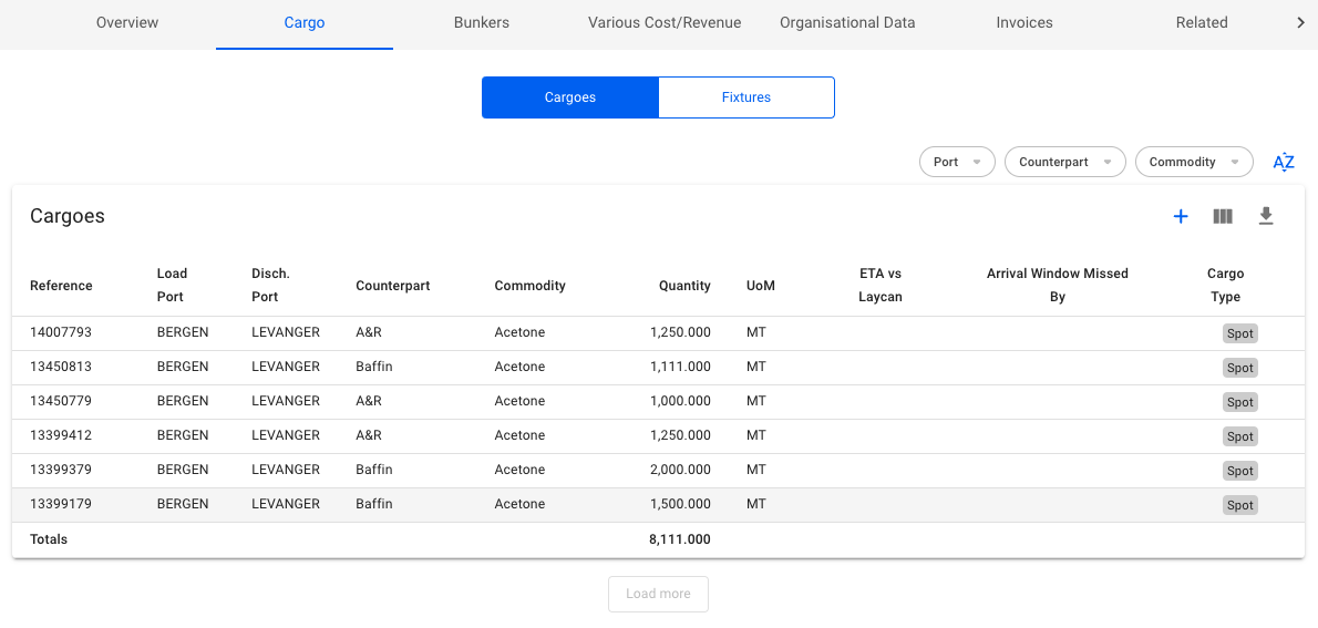 This tab shows a list of the cargoes and fixtures on the voyage.