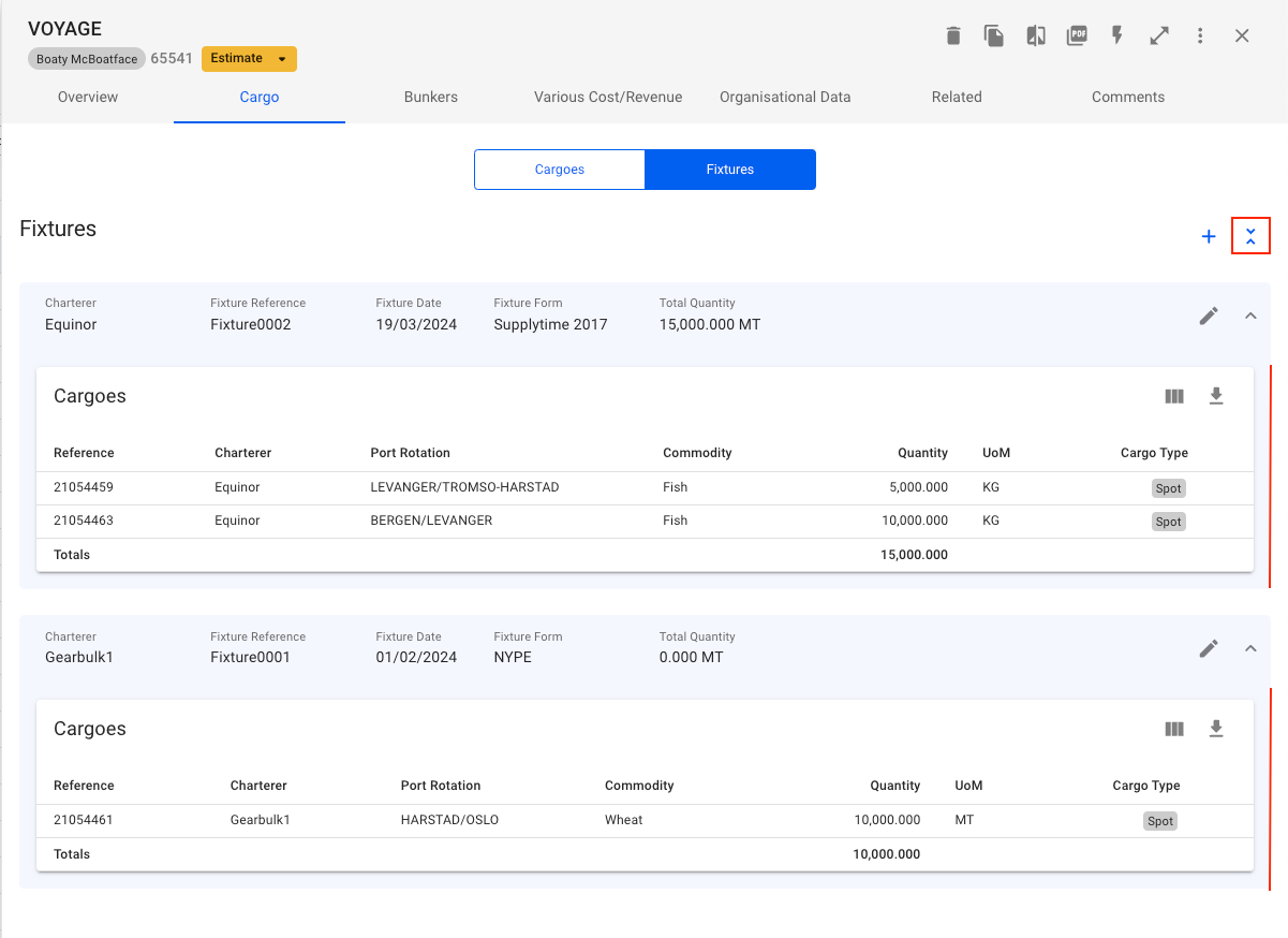 The fixtures list has a separate button to collapse/expand the cargo list of all the fixtures with one click as shown below: