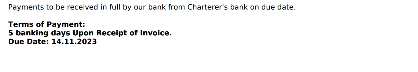 Shows the charterers VAT number underneath the payment details.