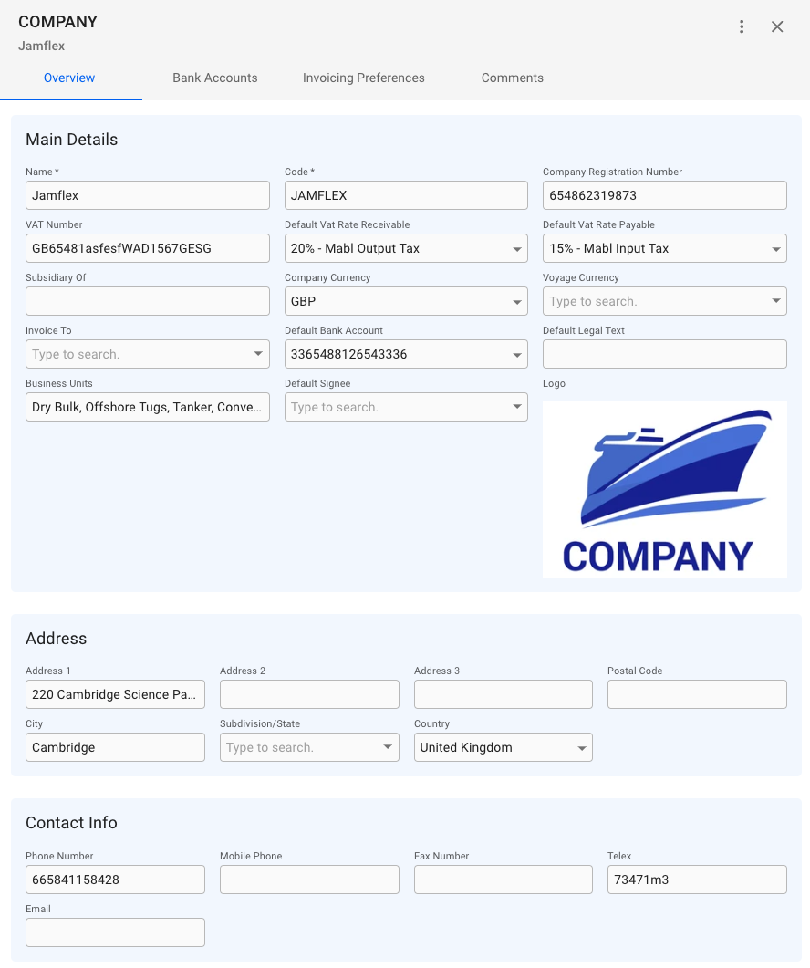 From the overview tab, you can see all the important details of a company such as Name, Code, Company Registration Number, VAT Number, different currencies, Business Units and more: