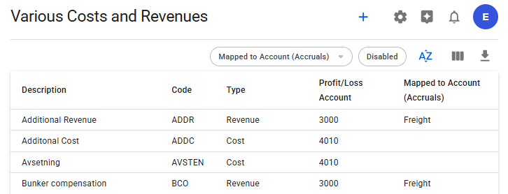Opening the "Various Cost and Revenues" module under "Master Data" will show a list of all available various cost/revenue.