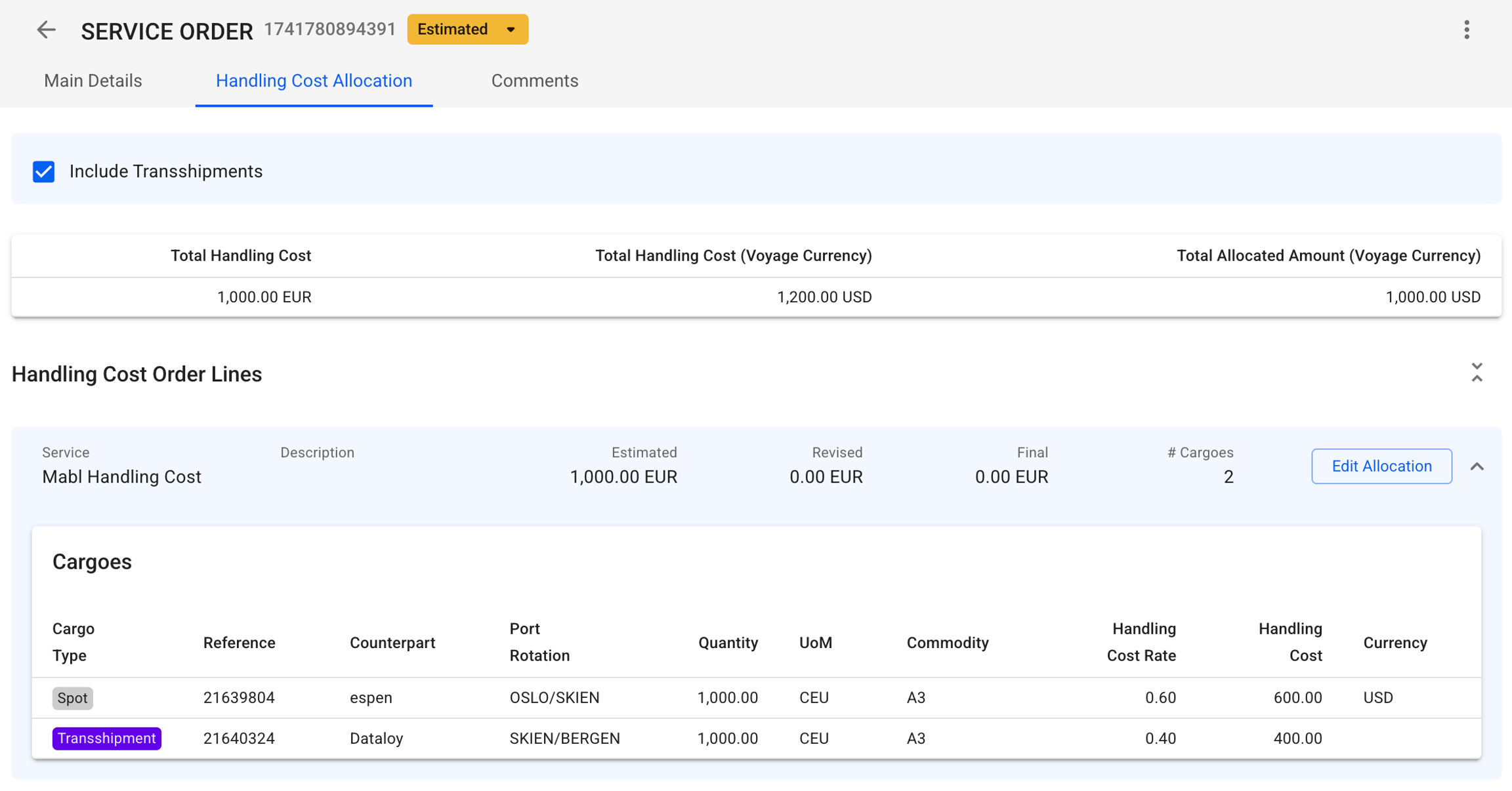 A list of all cargoes allocated to this handling cost order line
