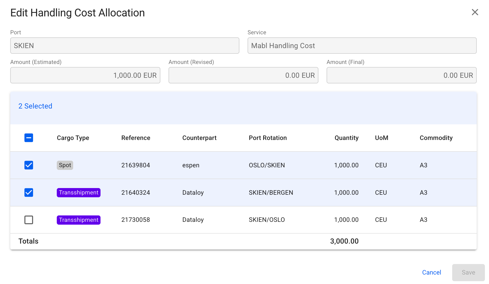 This is available from the HCA tab, at the top. Whenever you have transshipment cargo ports linked to this specific port call, you can decide to include them in the HCA proration by ticking the checkbox. You are then able to allocate/unallocate the transshipment cargoes as well, from the Edit Allocate modal view.