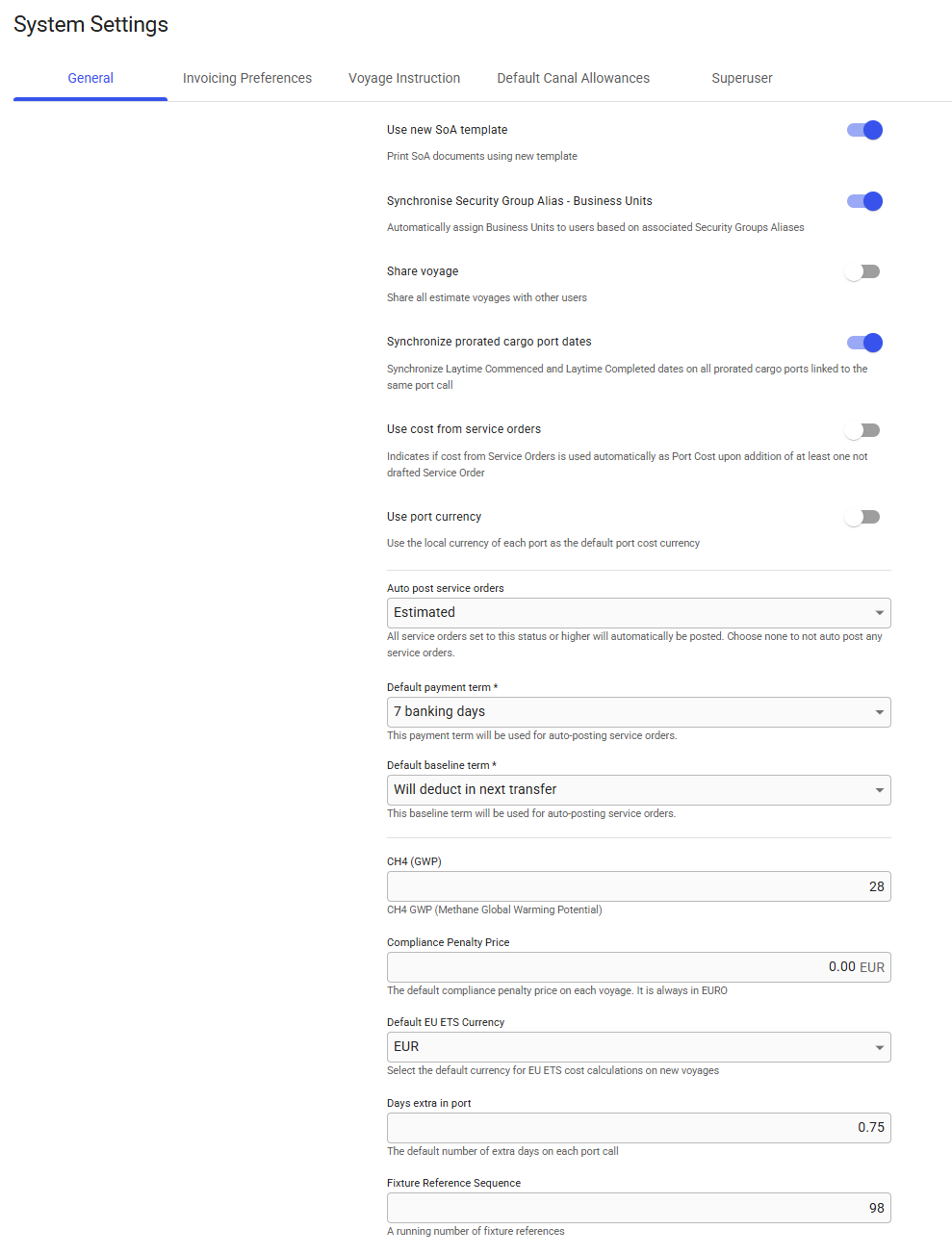 The settings on this page enable administrators to customize default behavior in VMS, e.g. Days extra in port controls the number of extra days automatically added to new port calls. Note that these system settings are applied globally to the environment, which means any change alters the functionality for all users (click for better view):