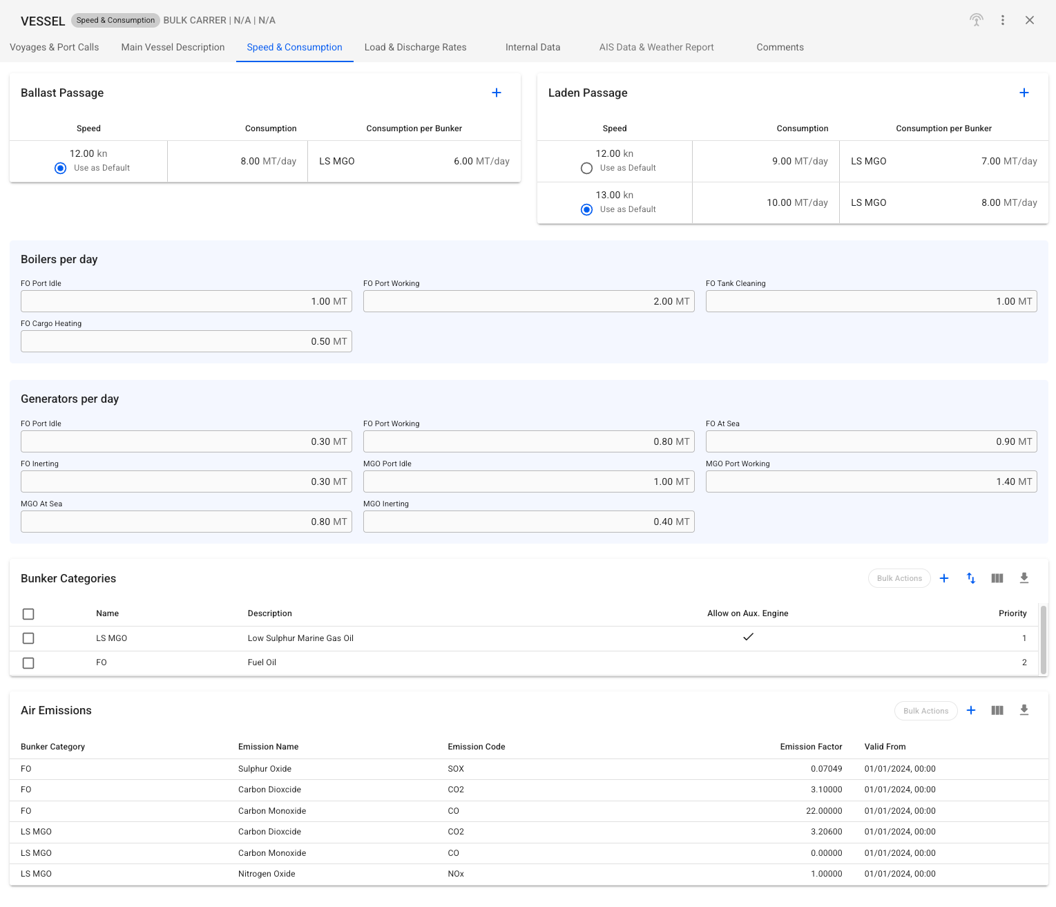 The top two cards identify Ballast and Laden speeds along with their corresponding fuel consumption for the selected vessel. These cards also allow specifying different consumption for any bunker category. This configuration will be used as default for all vessel's voyages, but may be adjusted for each voyage in the voyage module. A new passage configuration can be added by clicking the + icon. The added options will also be available in the voyage module for all vessel voyages. For example, the vessel in the screenshot from figure 1 has the following configuration: