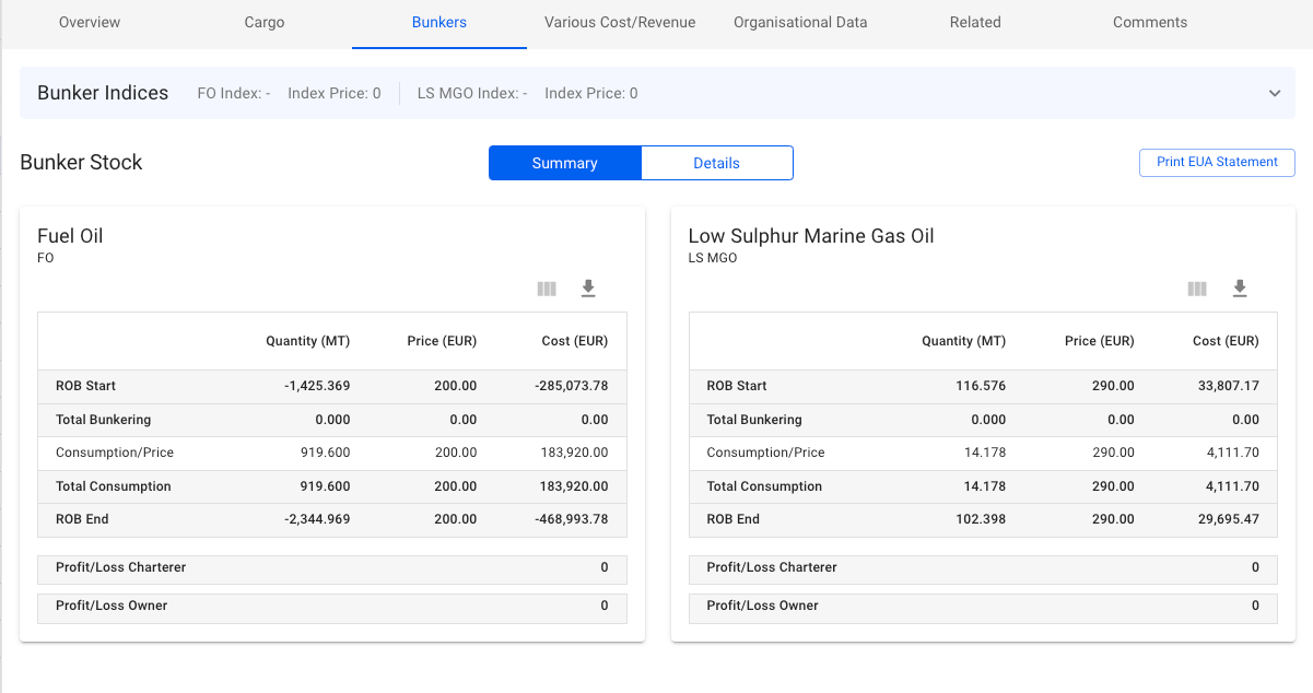 Yet, the Print EUA Statement button is always visible. This function generated a descriptive report of EU ETS consumed per port, specifying the percentage used in calculations, and associated consumption per leg.