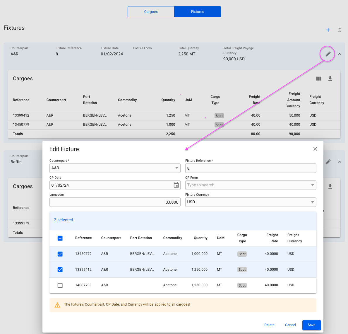 Clicking the Edit icon will open up the Edit Fixture modal, where you can change fields and select more or de-select cargoes.