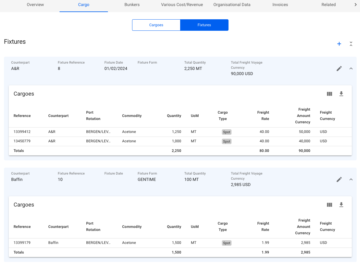 This tab shows a list of the cargoes and fixtures on the voyage.
