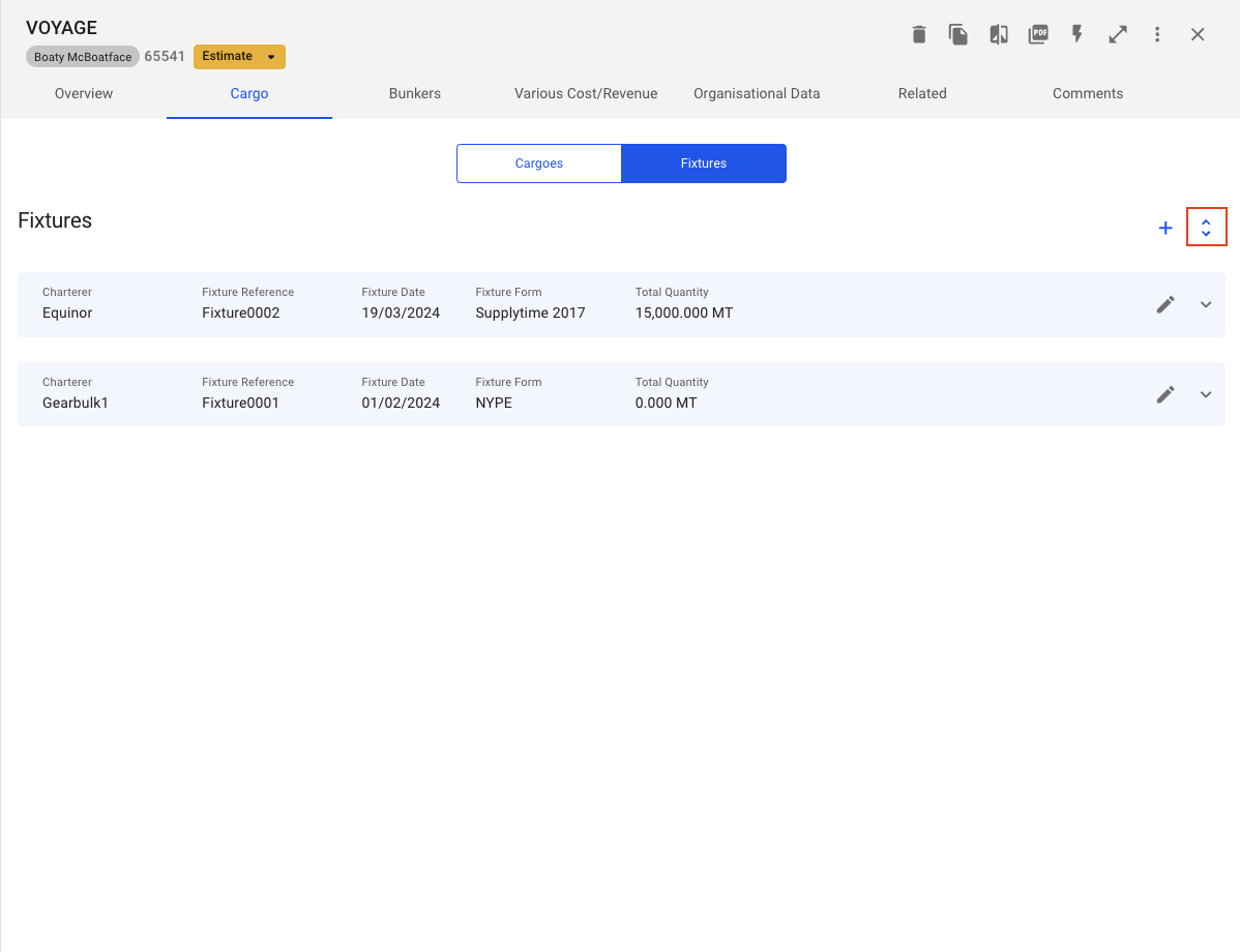 Adding fixtures can be done in the Cargo tab of the Voyage Drawer by selecting the Fixtures button and clicking the create icon above the list.