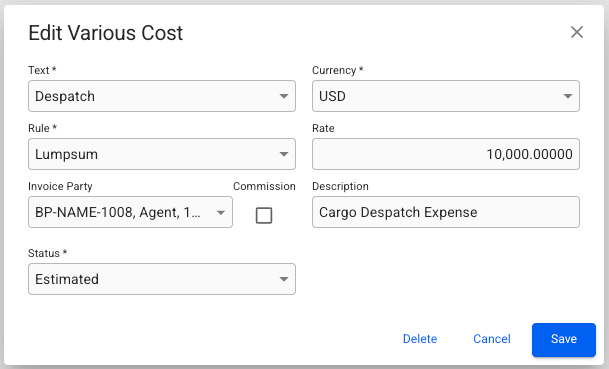 Create, Edit & Delete Various Cost/Revenue