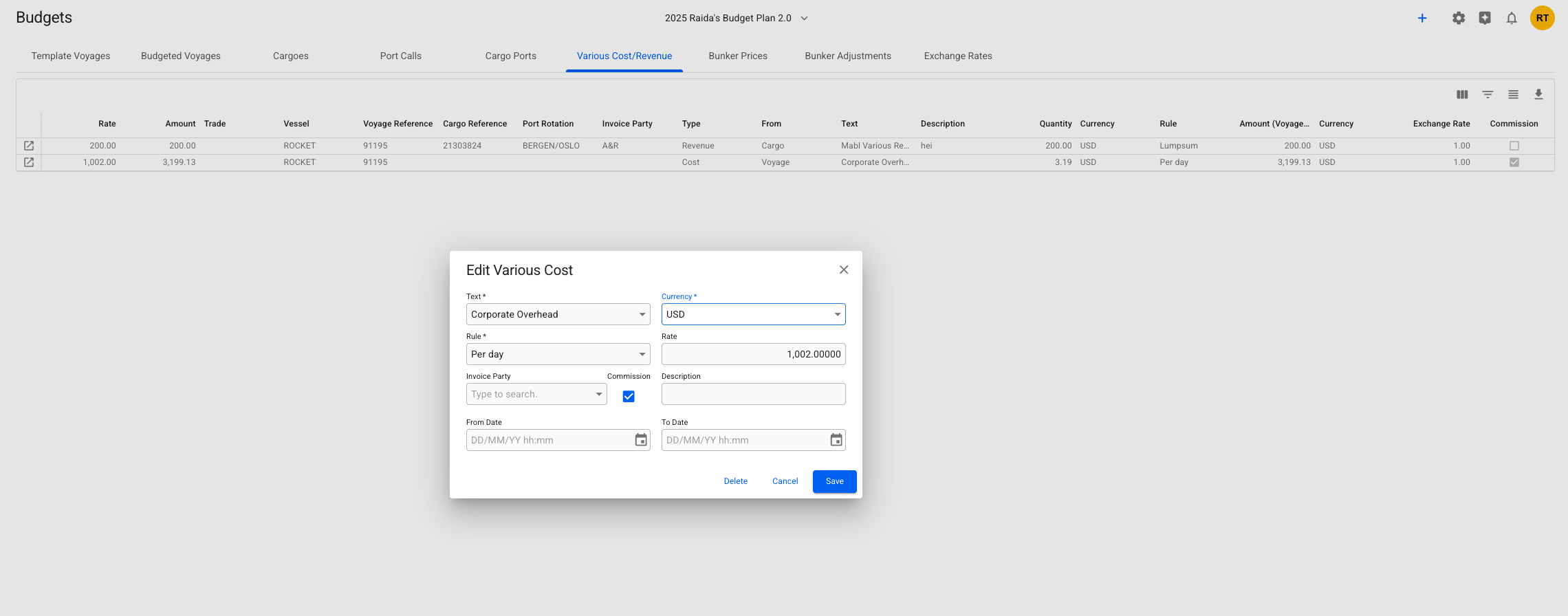 By clicking the ![](https://content.gitbook.com/content/uZ9lzqgHX4JL1Df67xog/blobs/Vh7gjbsDboOiWZ4viMZ6/image.png)-icon in the left-most column, you will be able to *open* up the [Edit Various Cost or Edit Various Revenue modals](https://docs.dataloy.com/release-8.16/voyage-management-system/step-by-step-guides/voyages/maintain-voyages/various-cost-revenue/create-edit-and-delete-various-cost-revenue#edit-various-cost-revenue) for that specific row, based on the Various Type. From the below view, you can edit the selected various: