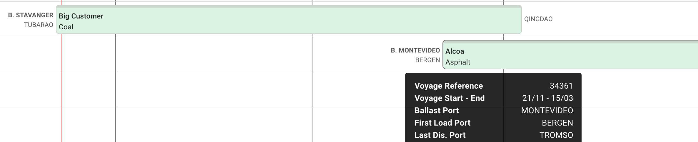 When hovering over a *scheduler bar,* a tooltip will pop up with additional information about the voyage: