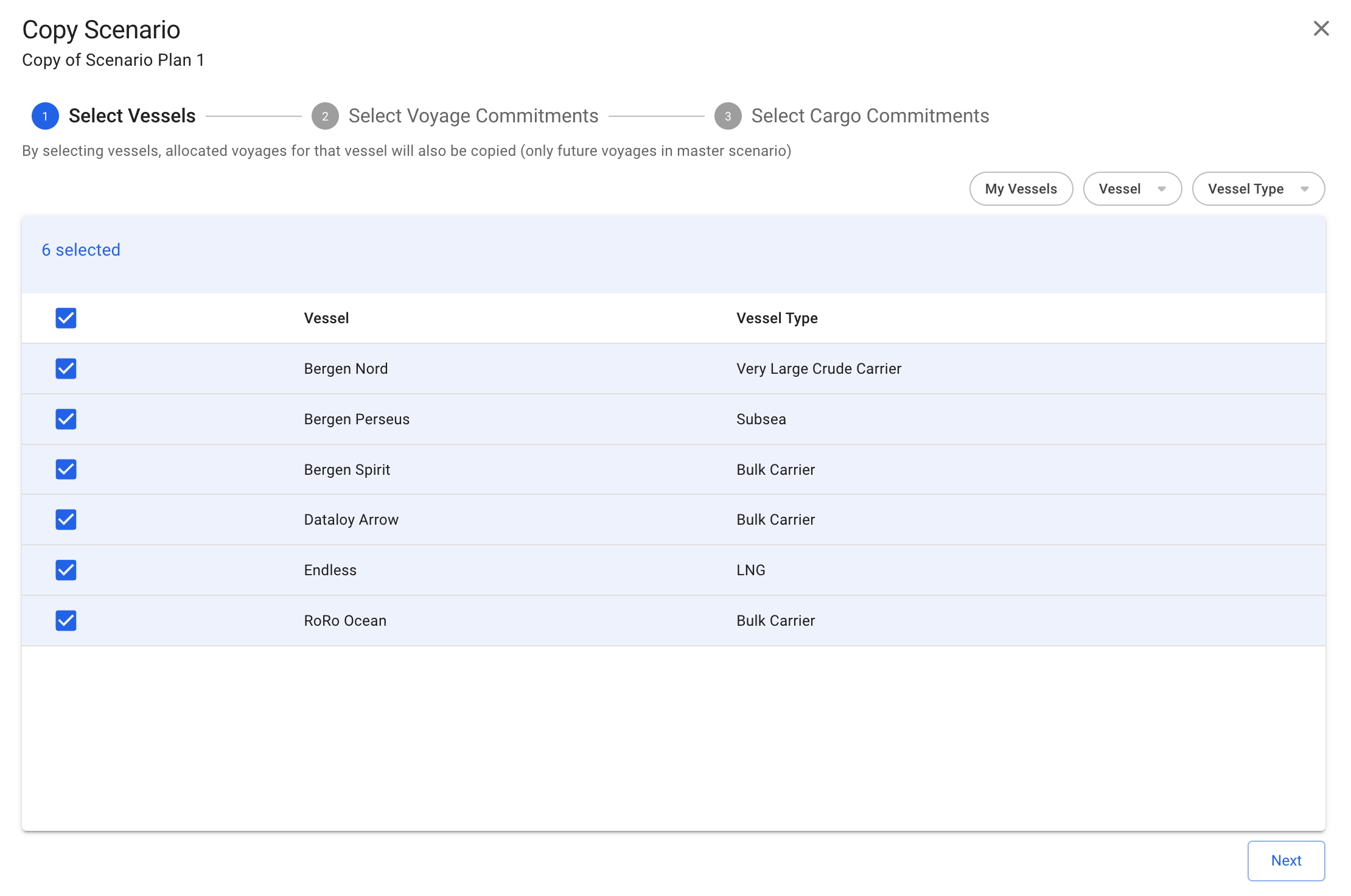 A list of pre-selected **vessels** of the original scenario that you want to copy from will show. You will have the option to un-check unwanted vessels for the "new" scenario as well. The list contains of vessels, which includes their *allocated voyages* and *cargoes,* from the selected scenario, and is sectioned by the vessel itself and its vessel type.&#x20;
