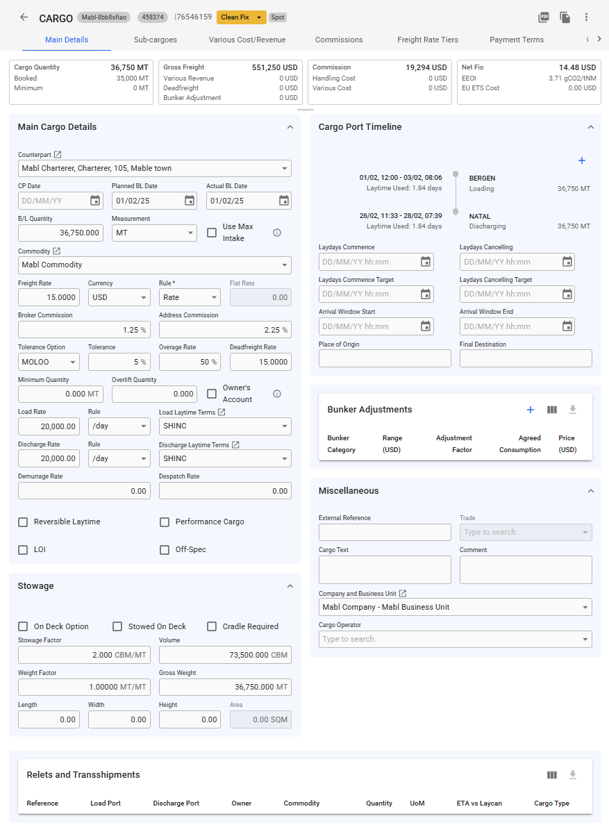To maintain the cargo click the cargo in the list. The selected cargo will be opened in a cargo drawer where you can edit fields, copy cargo, create a pdf from the booking and so forth. Click the cargo drawer page here to see more details.