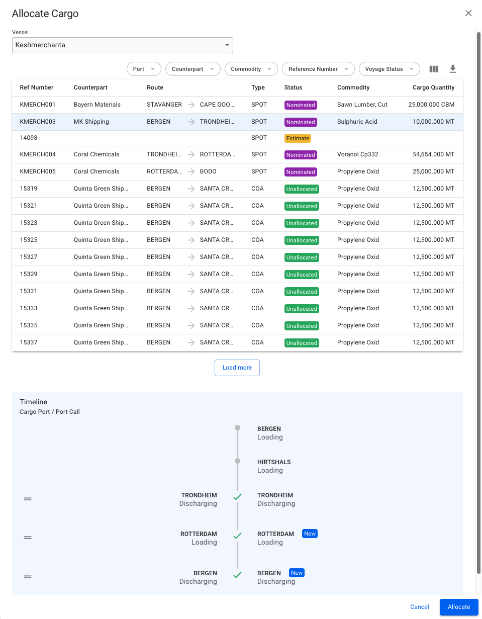 The allocation dialogue is a three-step process. Once you have selected a vessel, a list of all the voyages on the vessel will appear. Sort and filter the list to find the exact voyage you want, select it, and a preview of the voyage schedule will appear, with cargo ports on the left, and port calls on the right. The scheduler will attempt to link the existing port calls on the voyage with the cargo's cargo ports. If no port call exists, a new one will be created at the end of the voyage. These are denoted by a blue "NEW" chip. You can re-arrange the port calls by dragging and dropping.