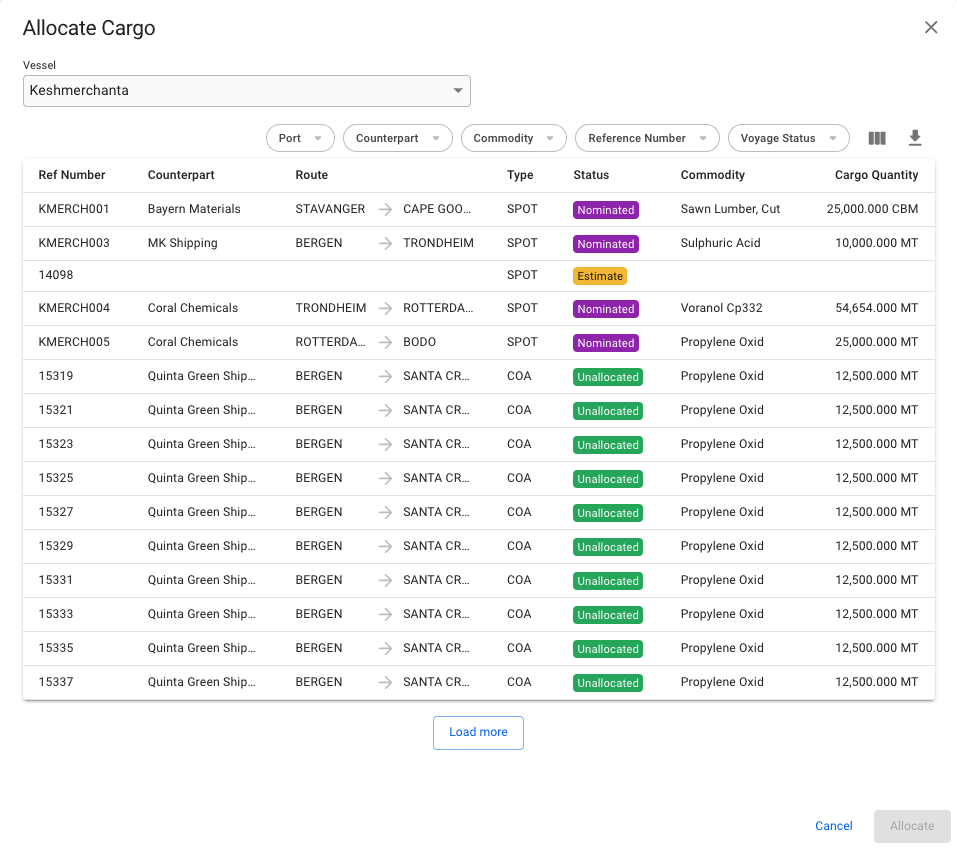 Only voyages with status Estimate, Unallocated, Allocated, Nominated and Operational that are part of the same Scenario will be available to select in the modal.