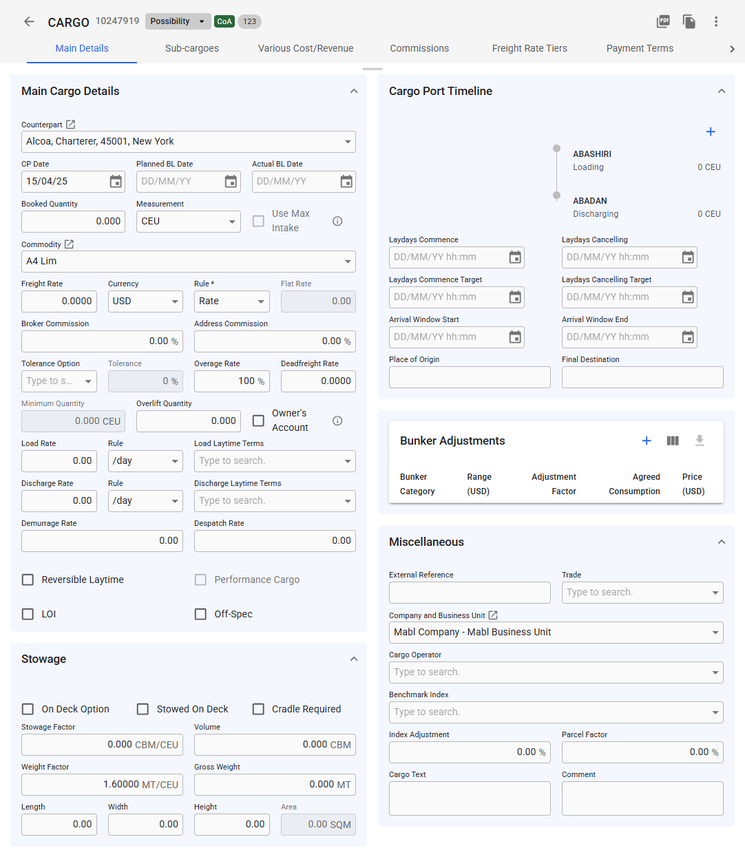 Also, by clicking the ![](https://content.gitbook.com/content/uZ9lzqgHX4JL1Df67xog/blobs/v6qZIr1DGnhJGFgnhleO/image.png)-icon, it is possible to copy the selected Template Cargo. Which will then be connected to the same CoA Line.&#x20;