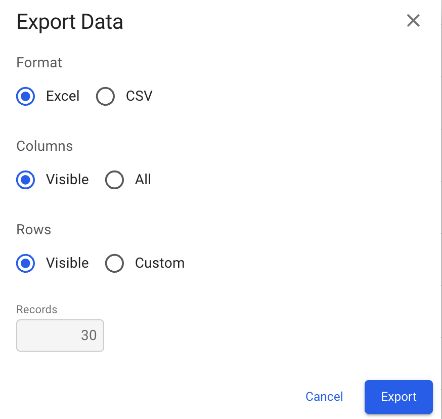 <figure><img src="https://content.gitbook.com/content/uZ9lzqgHX4JL1Df67xog/blobs/ZaqGeADBhqzOvKLBWEdj/Screenshot%202024-08-22%20at%2012.46.18.png" alt="" width="375"><figcaption><p>Export Data Modal</p></figcaption></figure>