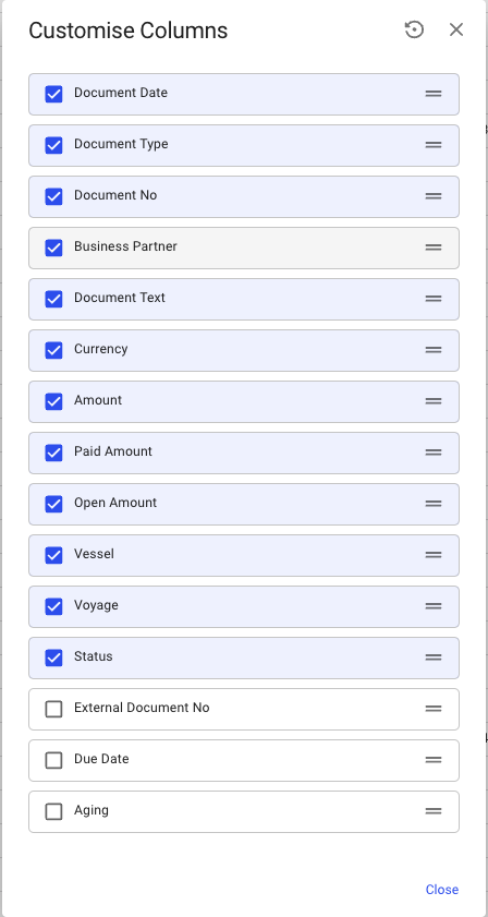 To the right of the Sorting button there is a button ![](https://content.gitbook.com/content/uZ9lzqgHX4JL1Df67xog/blobs/ywVJsiS9ELUeRJuQ9kDk/view_column_rounded_24px.svg) that allows you to [Customise Columns](https://docs.dataloy.com/release-8.16/voyage-management-system/step-by-step-guides/customising-list-columns).&#x20;