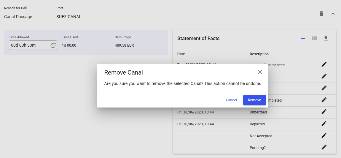 To remove a canal calculation, locate the canal’s section header and click the trash-can icon at the top right. A confirmation popup will ask you to confirm the removal; once confirmed, the canal entry is deleted and its demurrage is deducted from the total.