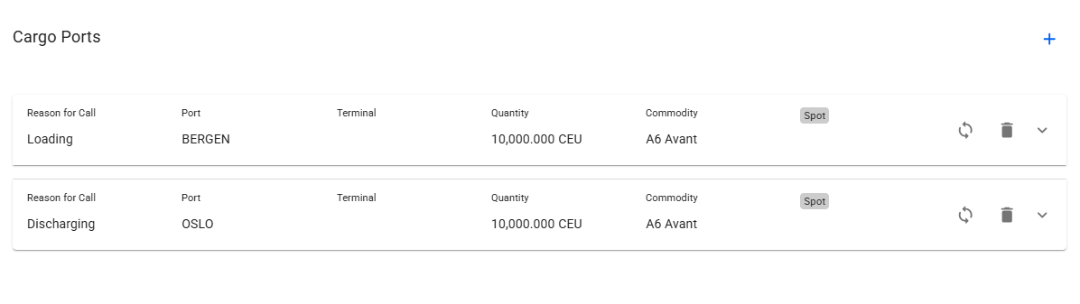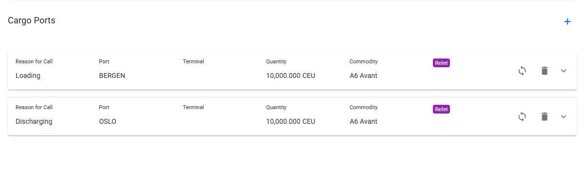 To make it easier to identify which cargoes are relet and connected to a spot cargo, a **chip** has been added to the section header. See the figures below.