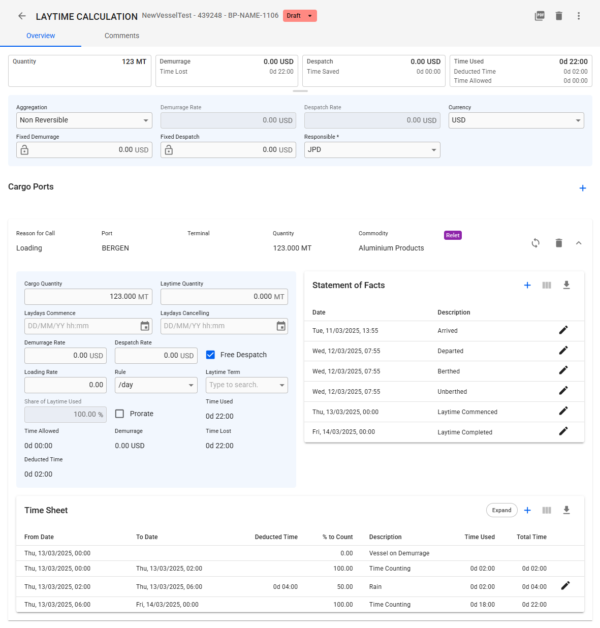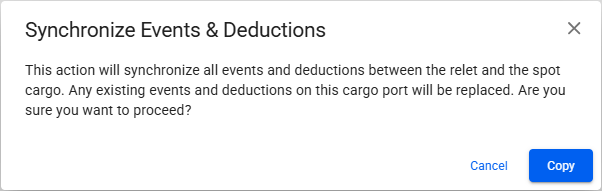 Starting with Release 8.7, it is now possible to synchronize [events](https://docs.dataloy.com/release-8.16/voyage-management-system/step-by-step-guides/operations/laytime-calculations/maintain-laytime-calculation/manage-cargo-ports/statement-of-facts) and deductions[ (not to counts) ](https://docs.dataloy.com/release-8.16/voyage-management-system/step-by-step-guides/operations/laytime-calculations/maintain-laytime-calculation/manage-cargo-ports/timesheet)between a relet and the corresponding spot cargo, and vice versa. This reduces the manual effort needed when [reletting a cargo](https://docs.dataloy.com/release-8.16/voyage-management-system/cargoes/maintain-cargoes/cargo-drawer-actions/relet-cargoes#relet-a-cargo) since you no longer have to copy the events and deductions manually.