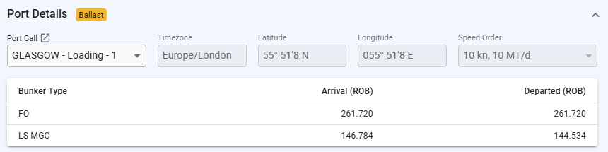 Non-deviation downtimes created by selecting a **Port Call** from the voyage schedule, will display some information about the port call, such as reason for call, speed order, and bunker ROBs in the Port Details section.&#x20;