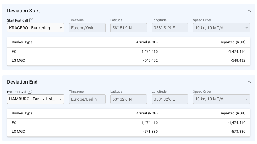 For Deviation downtimes, the Port Details section is split in two; **Deviation Start** and **Deviation End**. With the sole exception that you are not allowed to choose a canal passage as a port call, they are identical to the Port Details section.