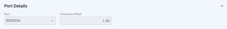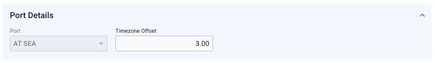 For simpler downtimes created using Port. The section will display the port name and the timezone for that port, and both fields are uneditable. When the port is an **At Sea** port the timezone offset will be editable.