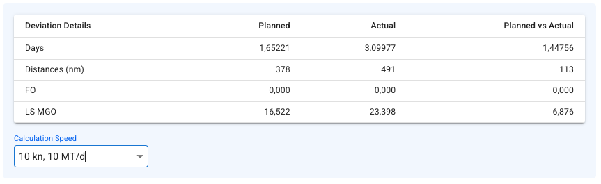Below these, a table for **Deviation Details** is displayed. This table shows you the difference between a direct route between the start and end port call, and the actual voyage schedule. You can also specify a specific speed for the vessel.
