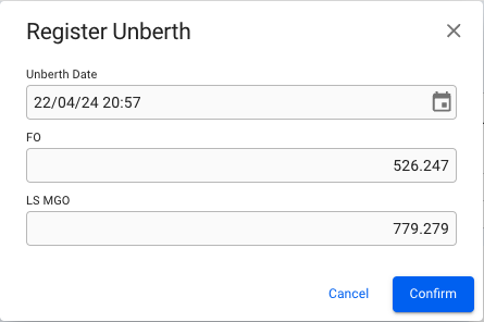 Then click the <img src="https://content.gitbook.com/content/uZ9lzqgHX4JL1Df67xog/blobs/n5W8t7gF19SI7vYm0DWy/Skjermbilde%202019-12-17%20kl.%2010.42.10.png" alt="" data-size="original"> icon at the top of the drawer and select "Register Unberth". A dialog will open, allowing you to enter the unberth date and the remaining quantity of bunkers on board upon unberthing.  The bunker categories listed here are only those that were used during the voyage.