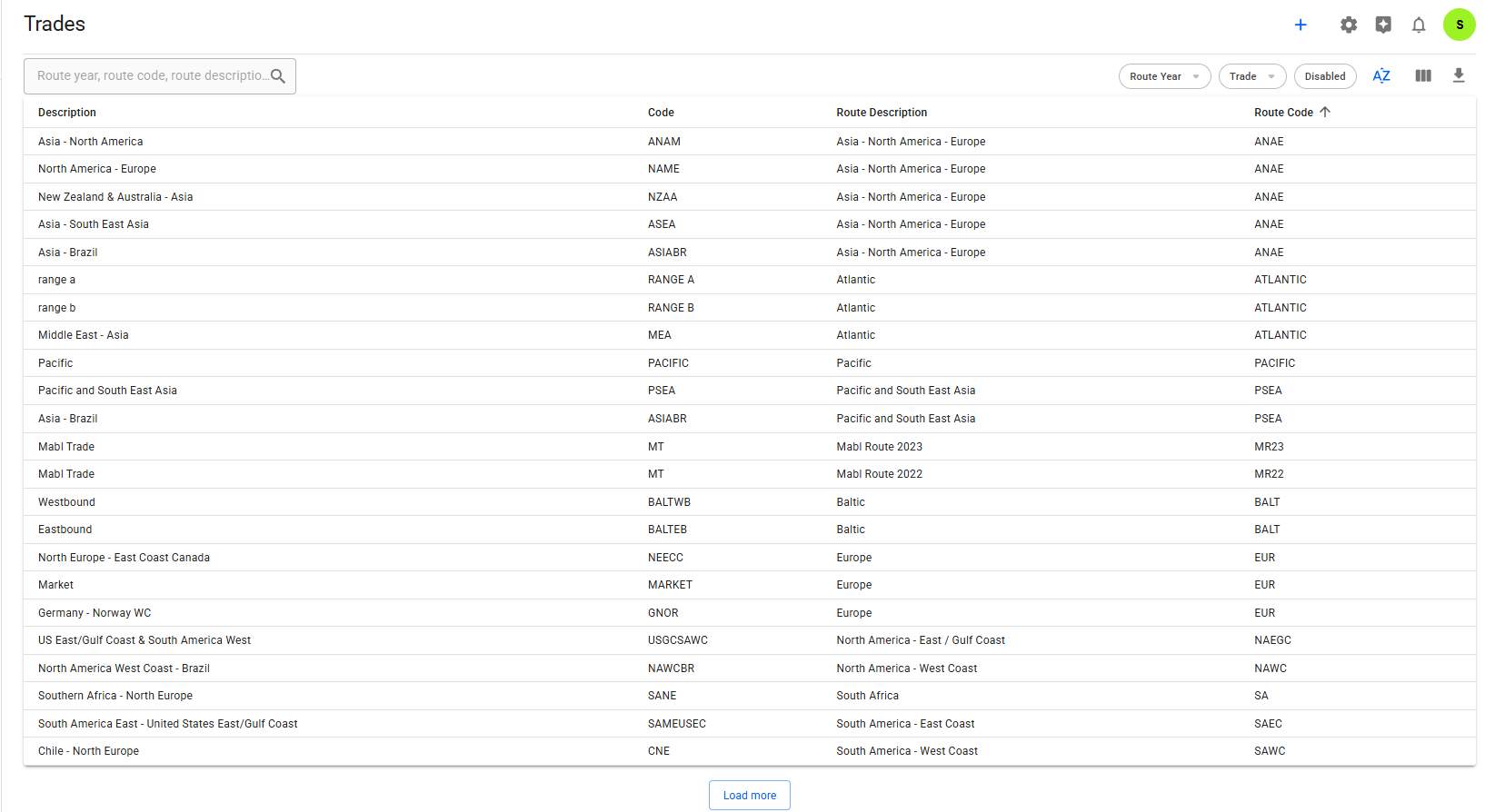 For sorting, look for the *arrow* to the right of the column headers or the blue ![](https://content.gitbook.com/content/uZ9lzqgHX4JL1Df67xog/blobs/Ezf4kiJqjSKKCUx6ypLP/image.png) icon above and to the right of the list. For filtering, you can use the *quick filters* provided above the Trades list. Which include filtering on the year, which trades and/or routes, and disabled trades.