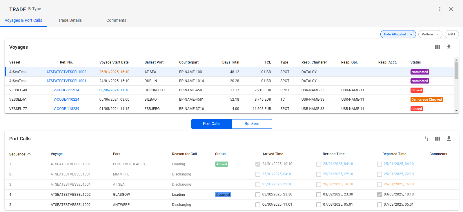 To maintain the trade click the trade in the list. The selected trade will be opened in a trade drawer where you can view all the voyages from a trade and the port calls and bunkers from these voyages, and edit the trade details.&#x20;