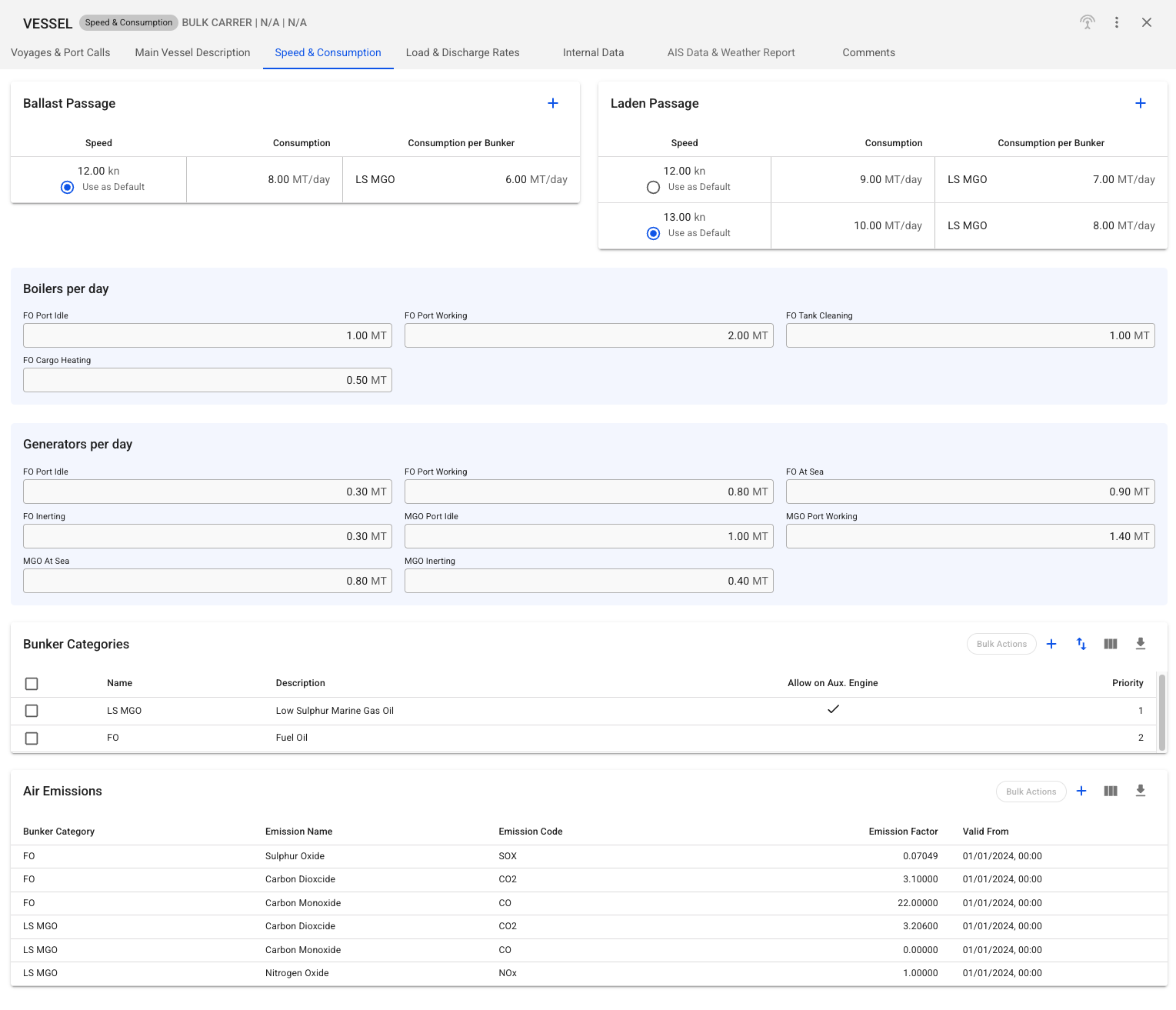 The top two cards identify Ballast and Laden *speeds* along with their corresponding *fuel consumption* for the selected vessel. These cards also allow specifying different consumption for any bunker category. This configuration will be used as default for all vessel's voyages, but may be adjusted for each voyage in the voyage module.\