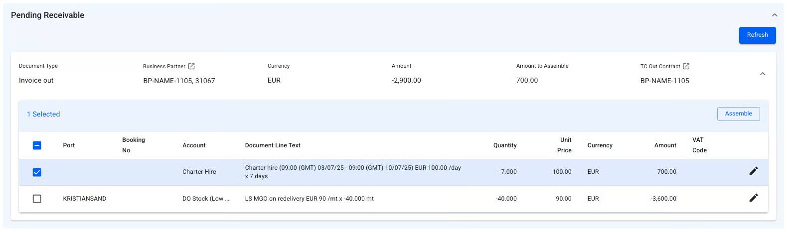 <figure><img src="https://content.gitbook.com/content/uZ9lzqgHX4JL1Df67xog/blobs/4nbR7PJmJpmPGEAwNkOx/Skjermbilde%202024-02-26%20kl.%2009.20.05.png" alt=""><figcaption><p><em>The invoicing list of the voyage, displaying the document lines for the invoices.</em></p></figcaption></figure>