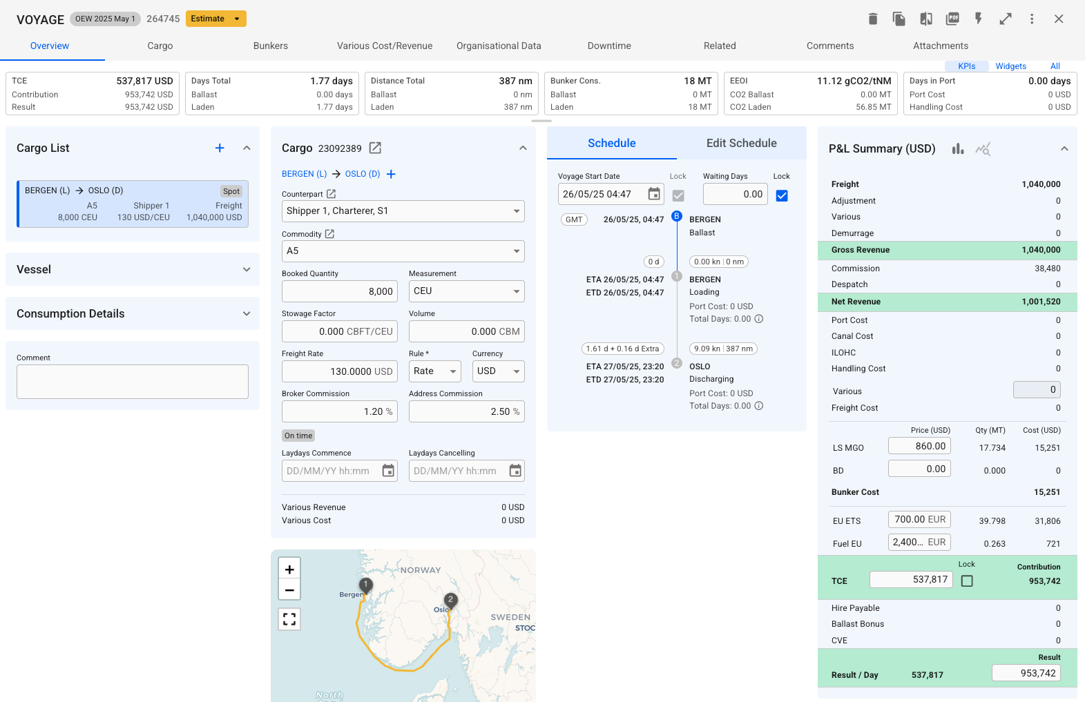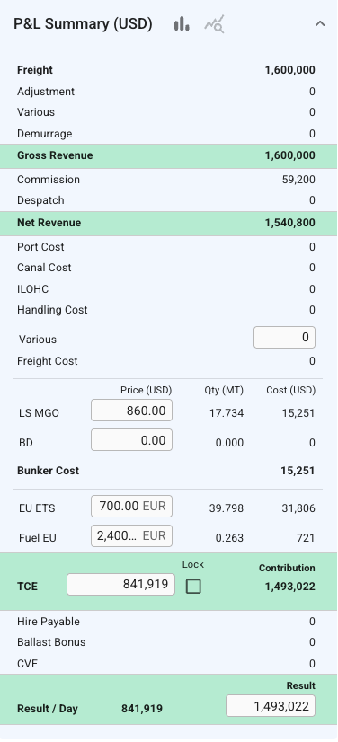 The summary section displays all cost/revenue items, including fuel consumption and price, related to either cargo, voyage, or port call. This breakdown displays different figures for Voyage Charter and Time Charter estimates.