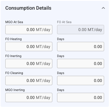 *Figure 1* shows the additional parameters related to consumption. Initially, these values are taken from the vessel but can be modified for each voyage.