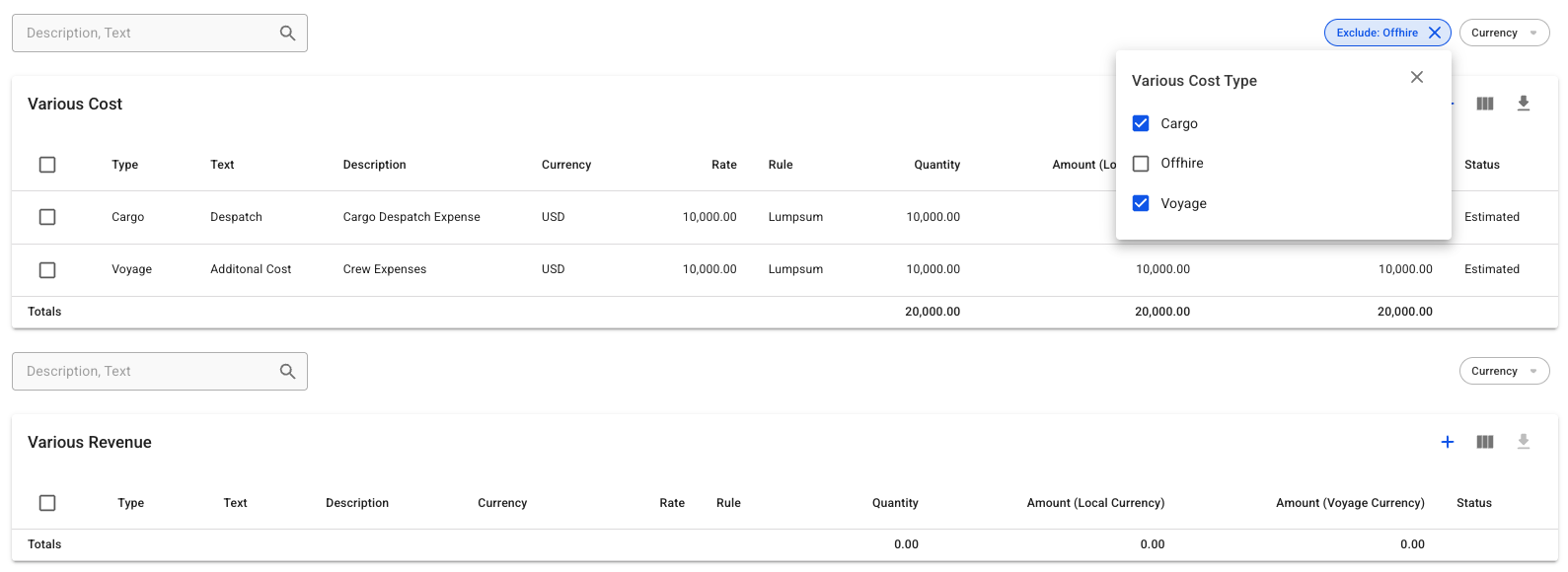 * **Voyage-Specific Filters** – If the voyage includes **Various Cost/Revenue** linked to **Cargoes** or **Off-hires**, a filter will appear in the top-right corner of the list. Use this filter to select which types of Various Cost/Revenue should be displayed.