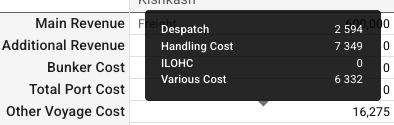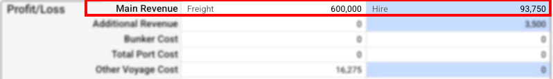 Contextual rows displays values that changed based on the context. In these cases, the cell includes a small label to the left, informing you of the source. An example of this is the Main Revenue row. For spot and relet voyages, the main revenue will be the freight. For a TC voyage, the main revenue will be hire.