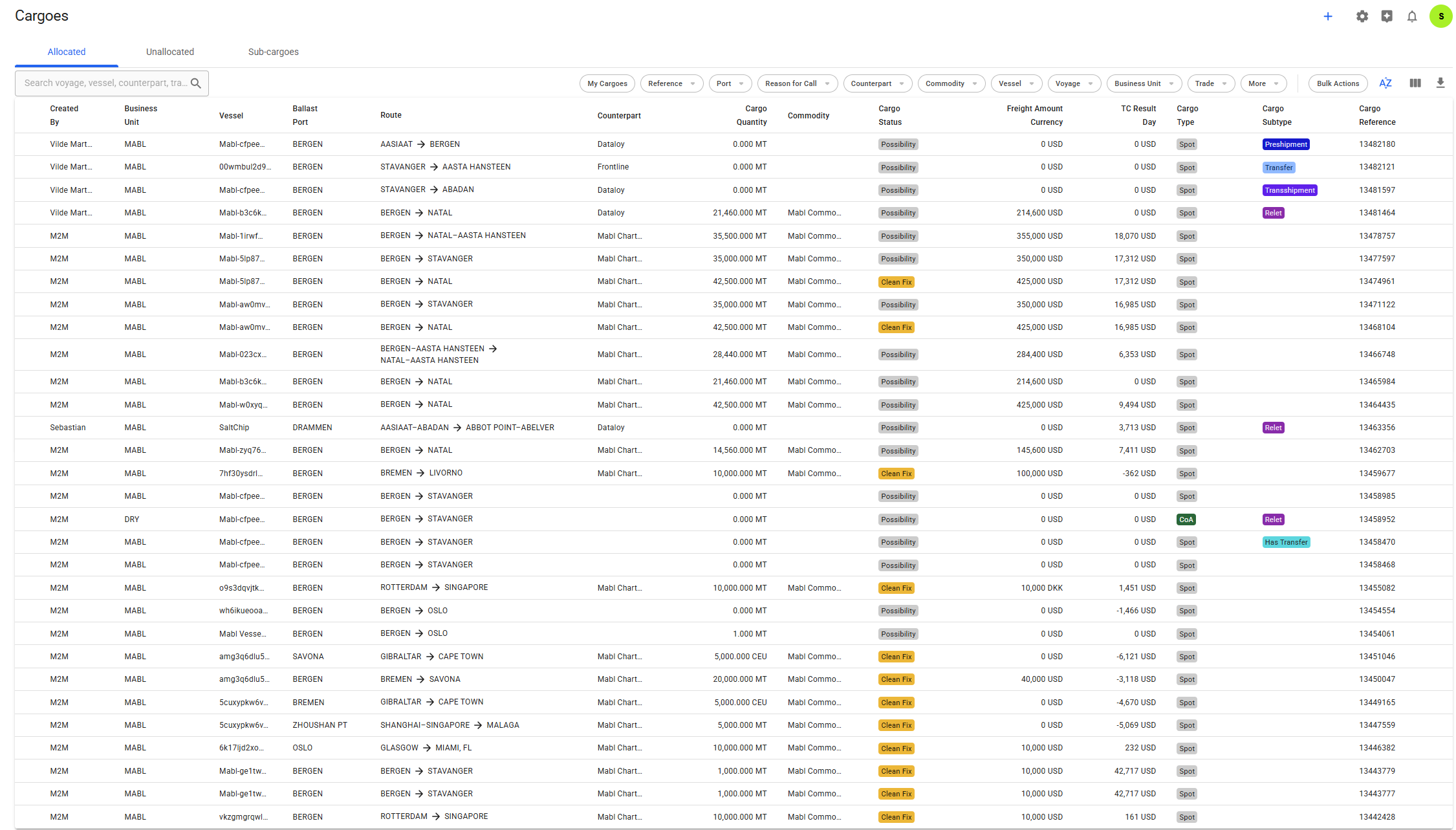 Both the lists Allocated and Unallocated shows cargoes of all statuses and types, while the Sub-cargoes list shows the sub-cargoes linked to different cargoes.