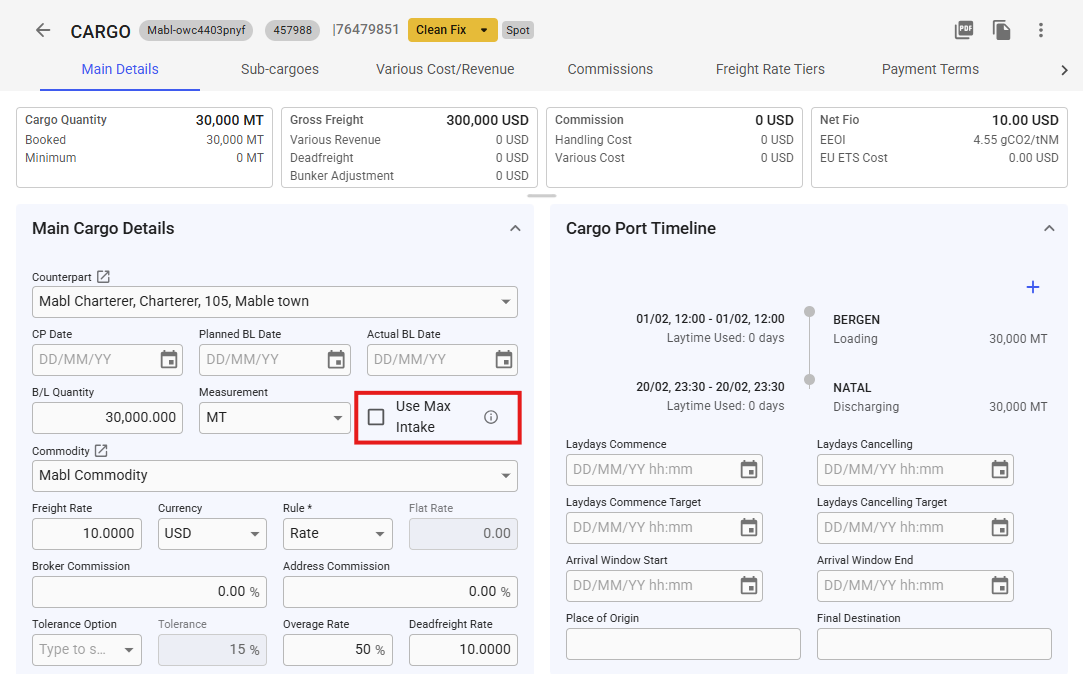 If the cargo has the tolerance option MOLOO, more or less owners option, then the commercial max is also considered in the intake quantity. The commercial max is calculated as the booked quantity + tolerance percentage. E.g. 10 000 as booked quantity with 10% tolerance gives a commercial max of 11 000.